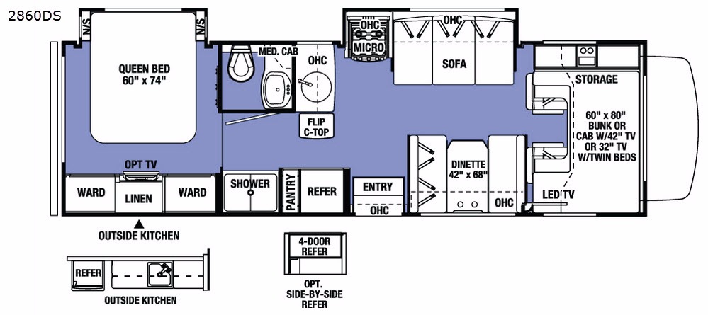 Continuing around from the shower, there is a pantry and a refrigerator or you can choose an optional four-door refrigerator. Past the entry door, there is a 42" x 68" dinette. The front of the cab features an overhead bunk that is 60" x 80" with additional storage as well, or you can choose optional cabinets with a 42" TV or optional 32" TV with twin beds.